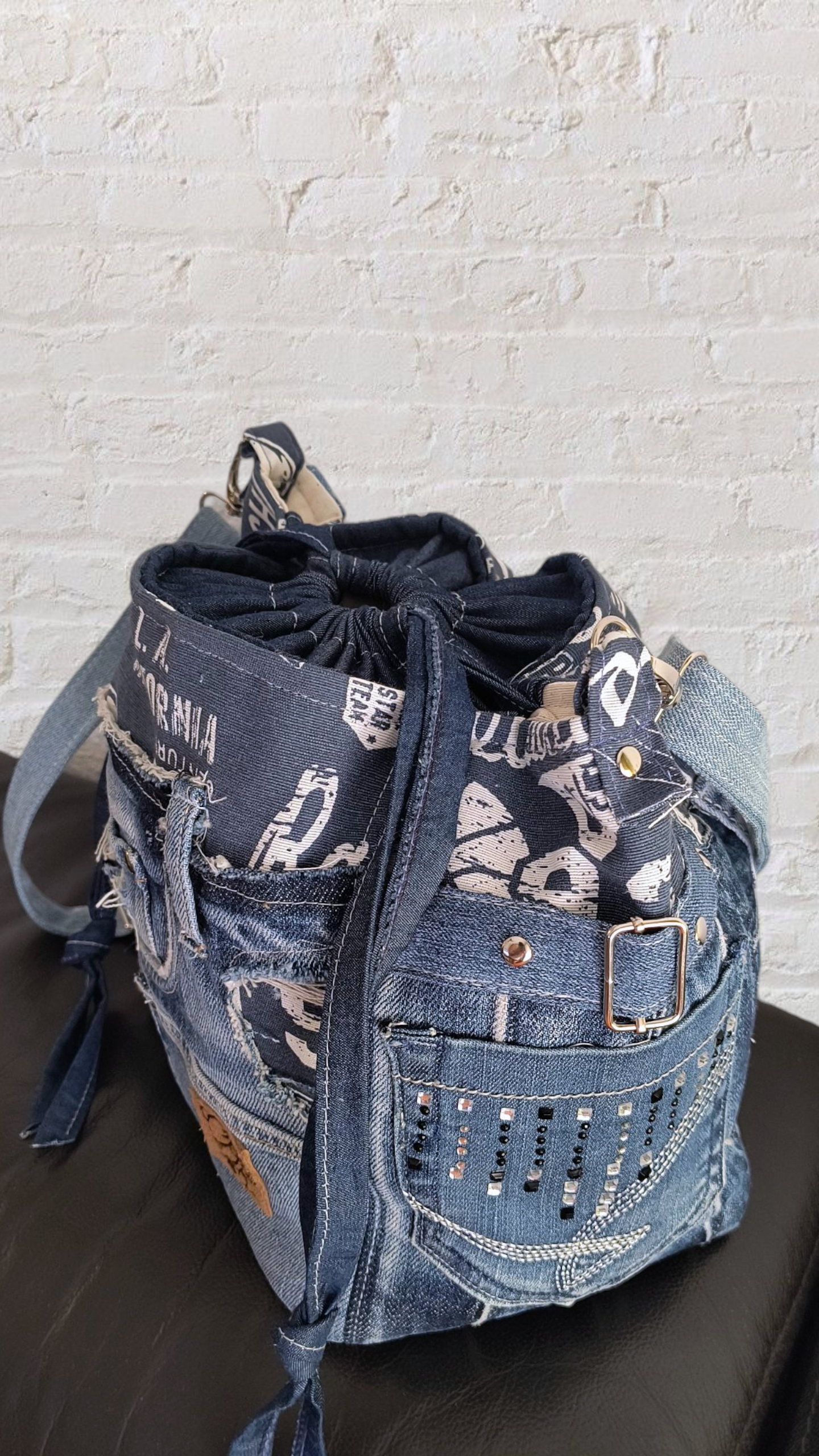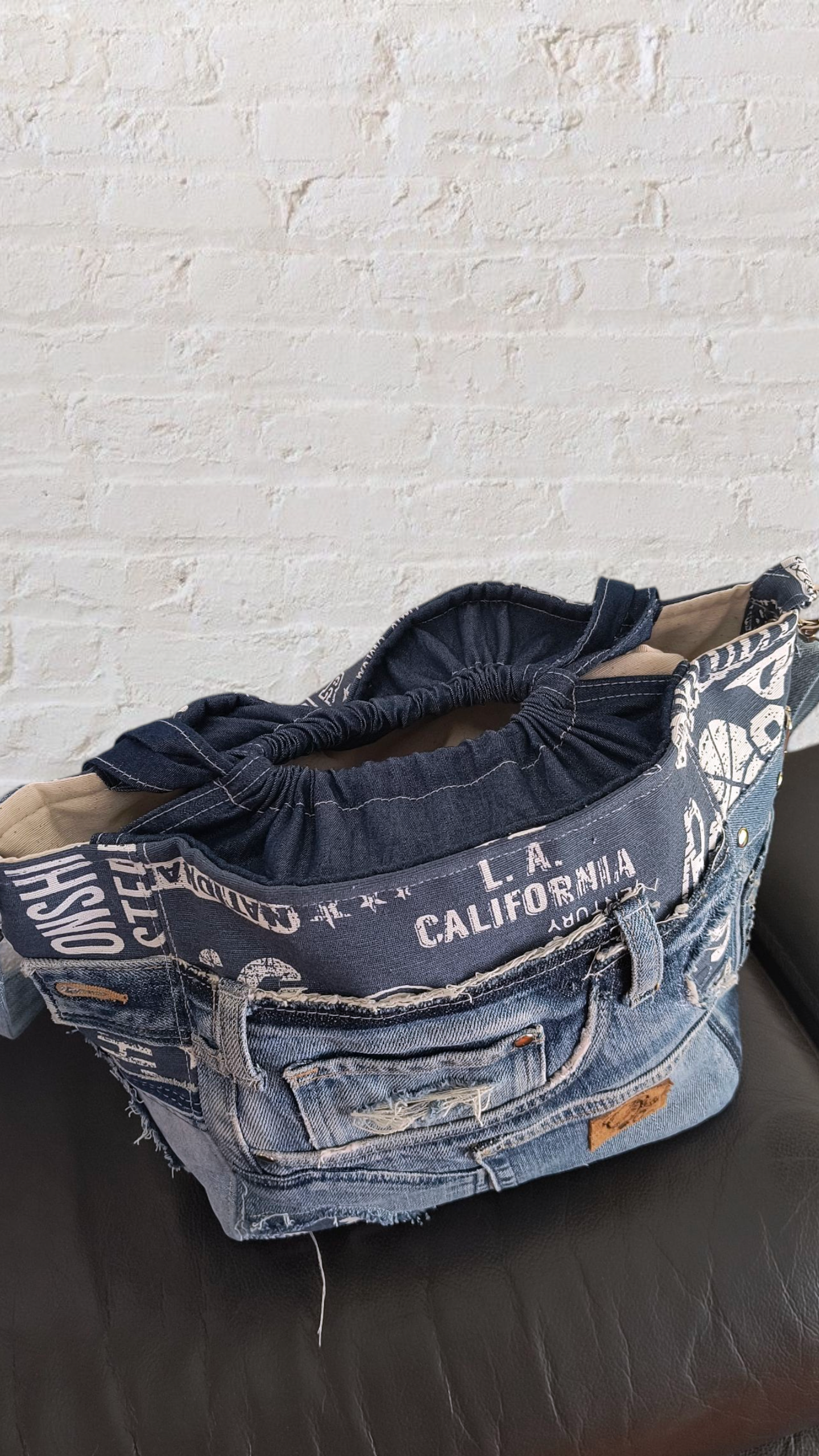 Lleva en el interior un bolsillo con cremallera, la cinta bandolera está realizada también en jeans y es ajustable.