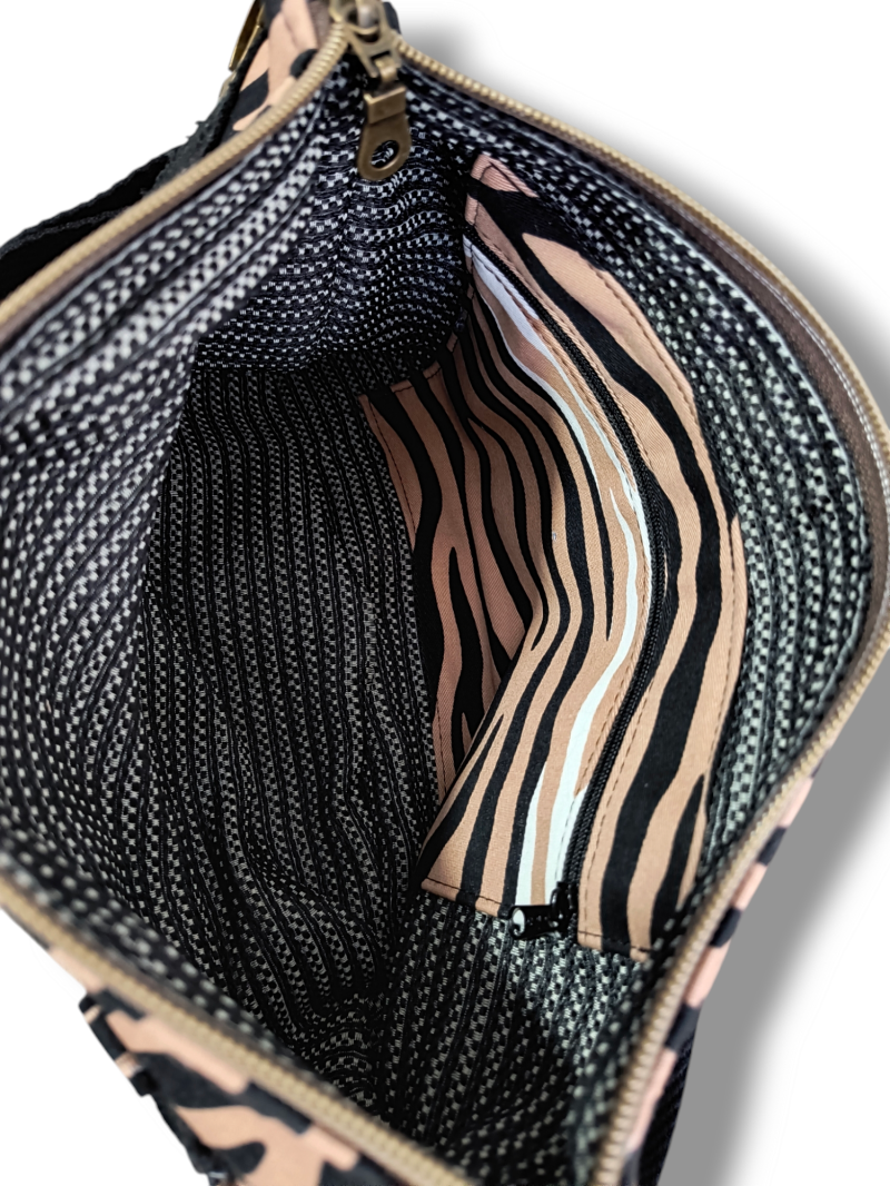 Bolso bandolera, realizado con jeans reciclados en color negro y loneta en cebra con fondo marrón.